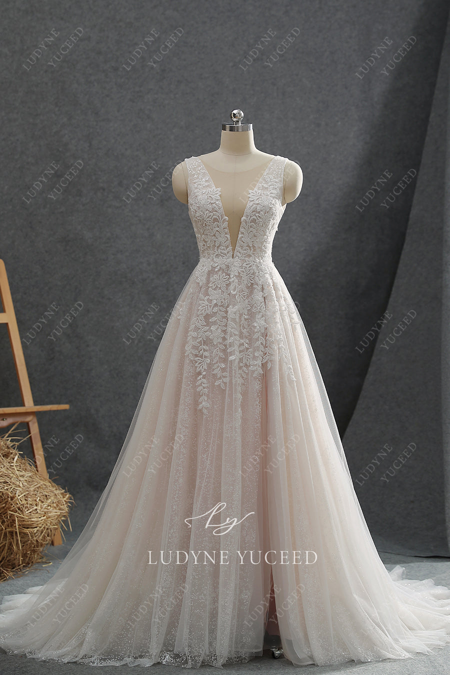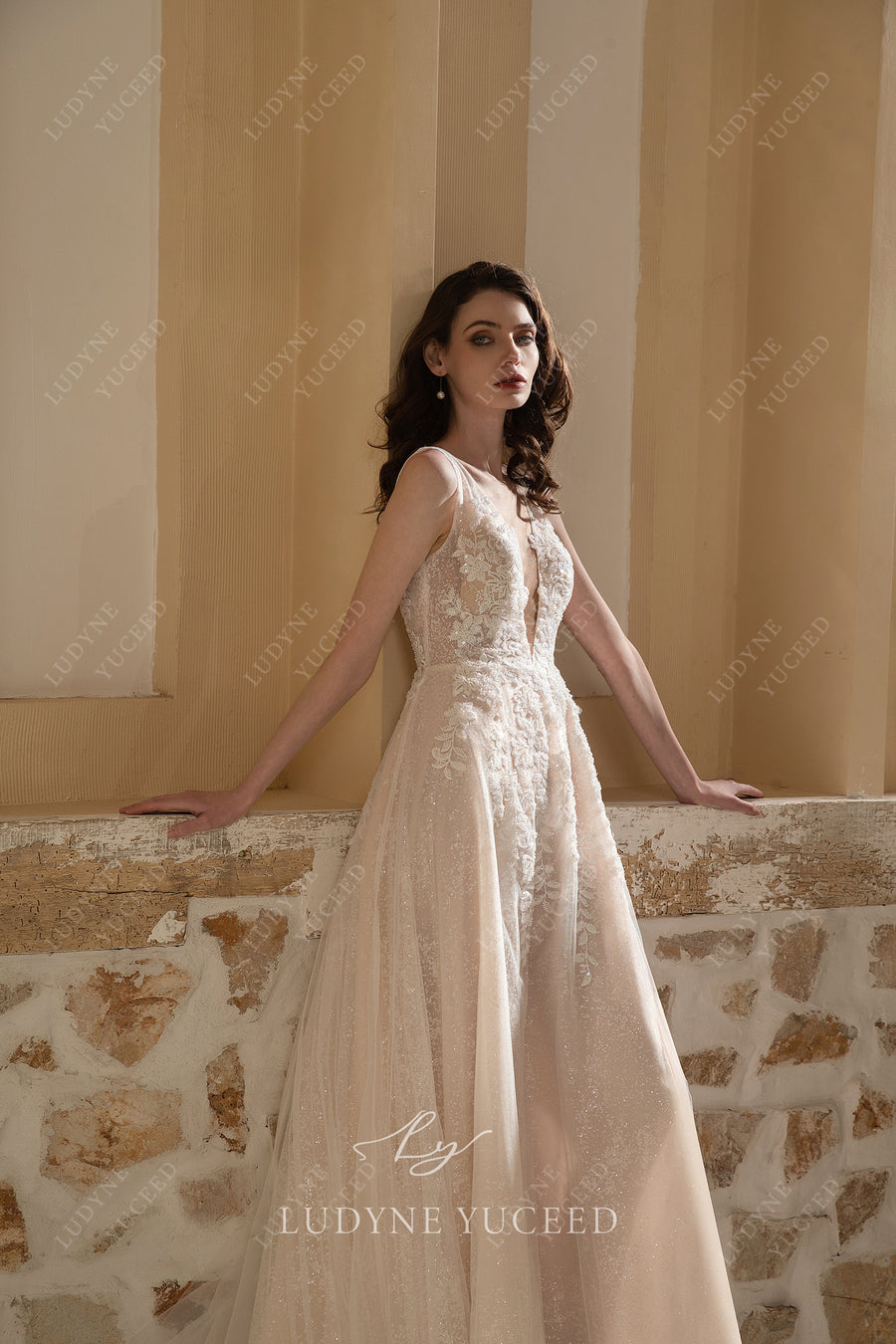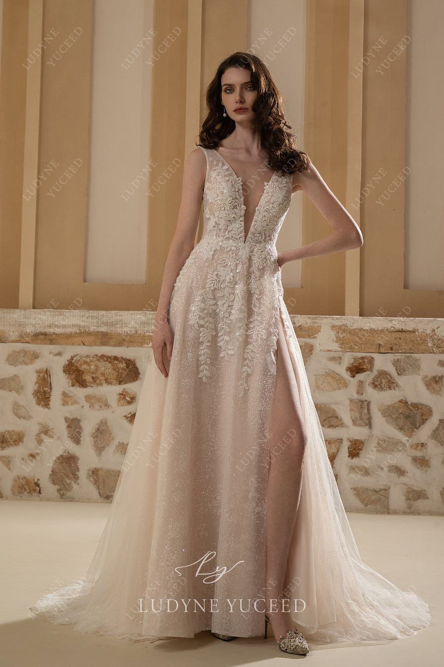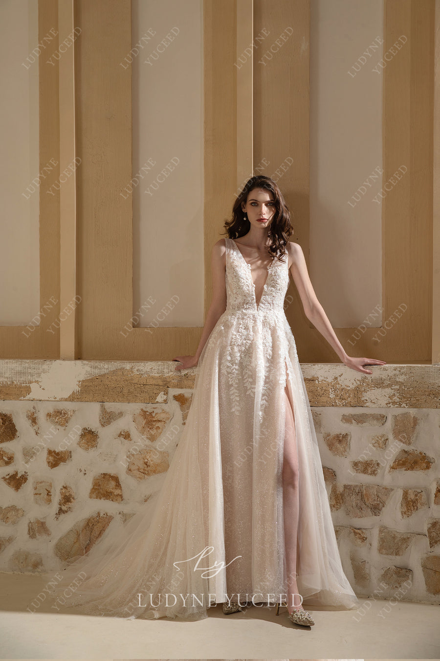 This is an elegant A-line wedding dress crafted with soft Organza , shimmer tulle and lace with beading and sequins. The plunging V-neckline with tank straps and front high slit adds the perfect touch of sexiness to complete this glamorous look.
