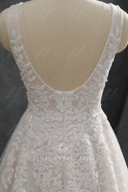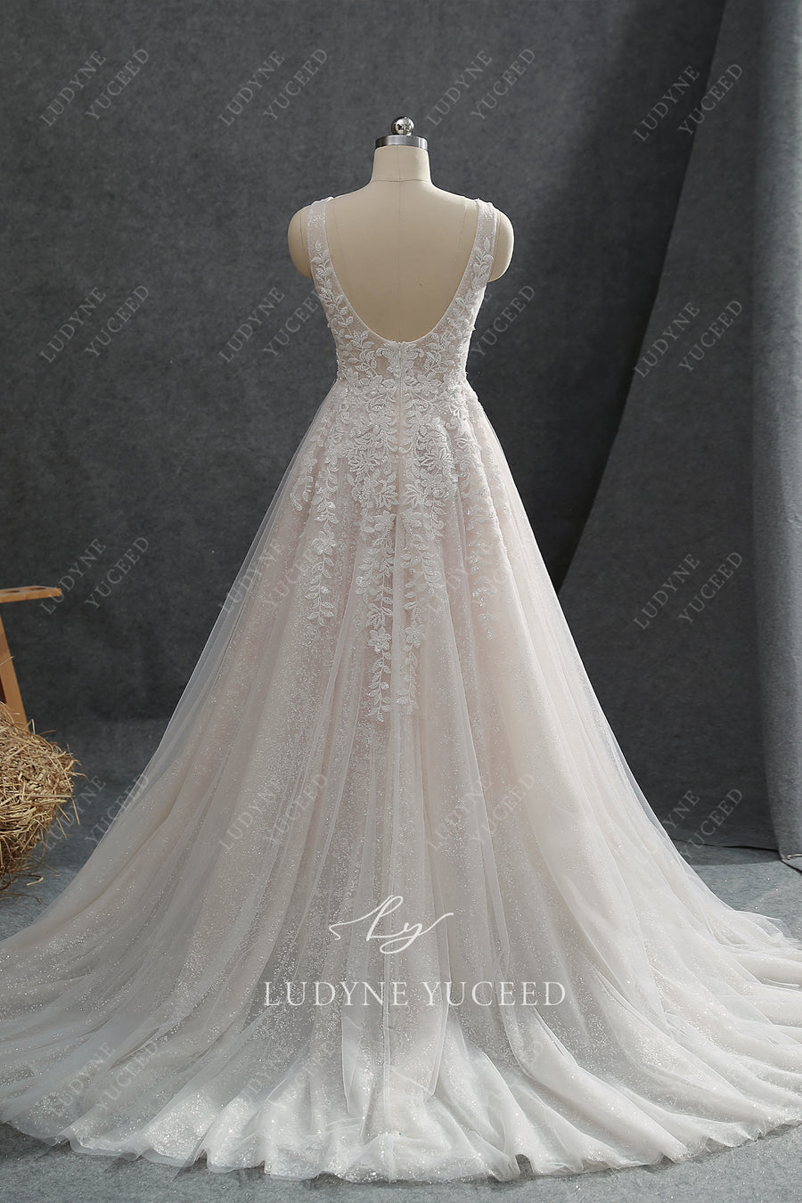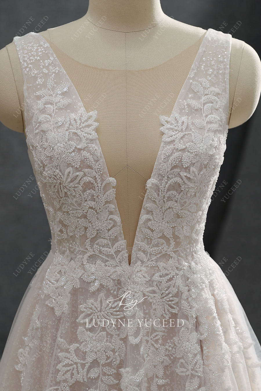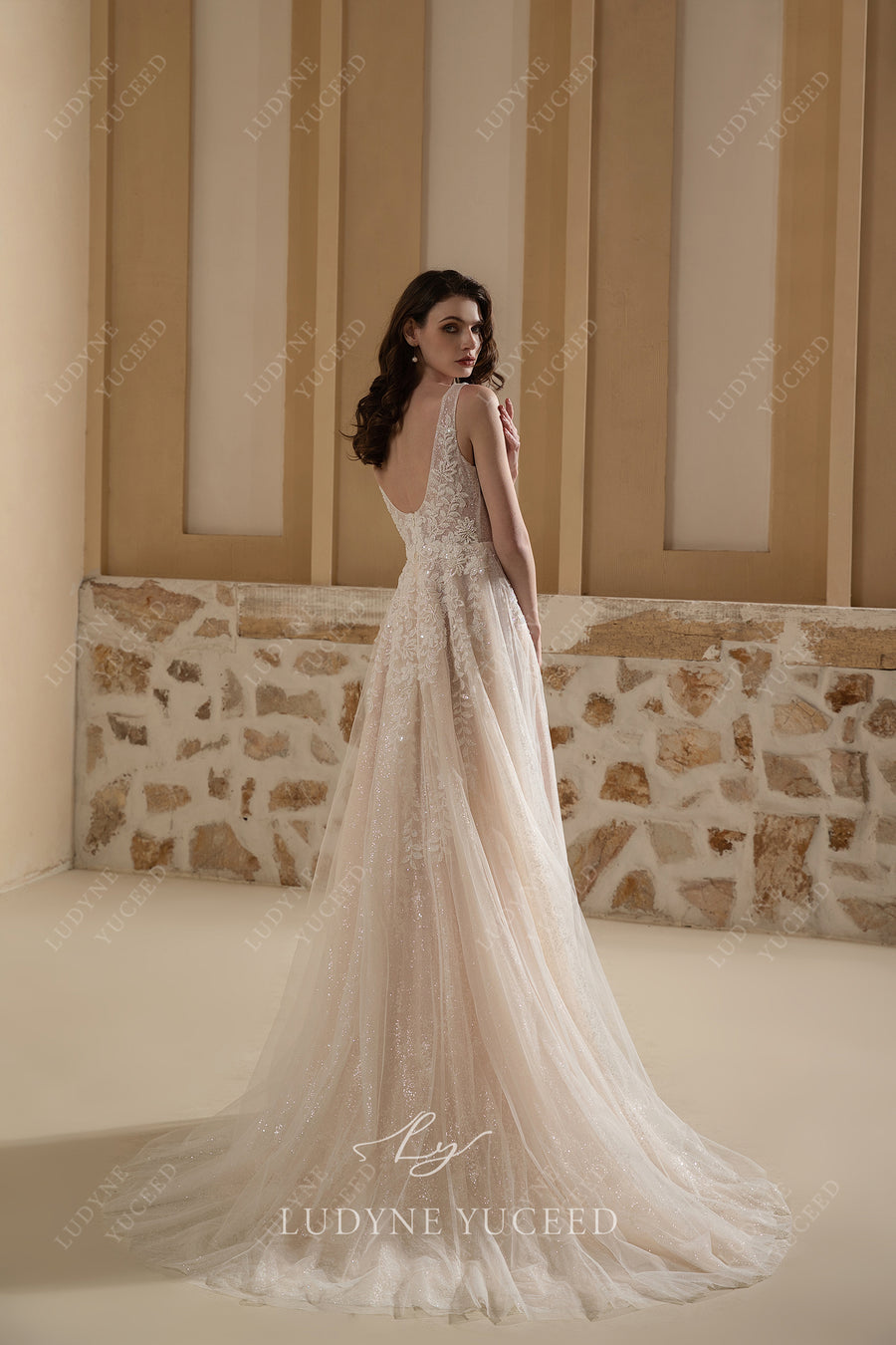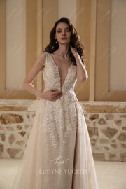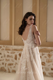 This is an elegant A-line wedding dress crafted with soft Organza , shimmer tulle and lace with beading and sequins. The plunging V-neckline with tank straps and front high slit adds the perfect touch of sexiness to complete this glamorous look.