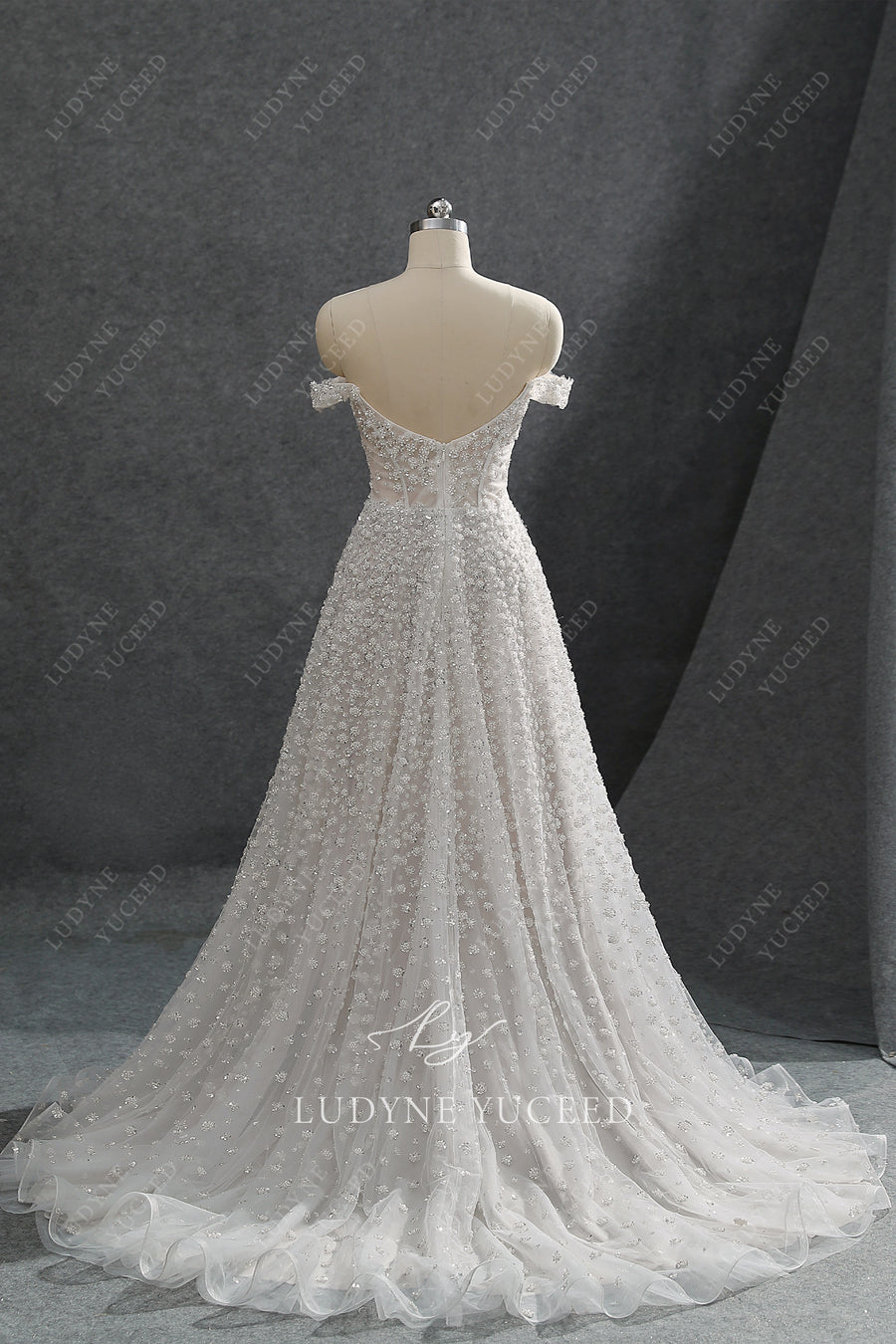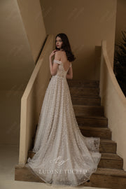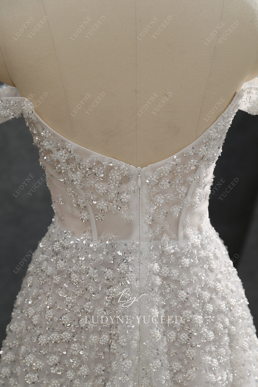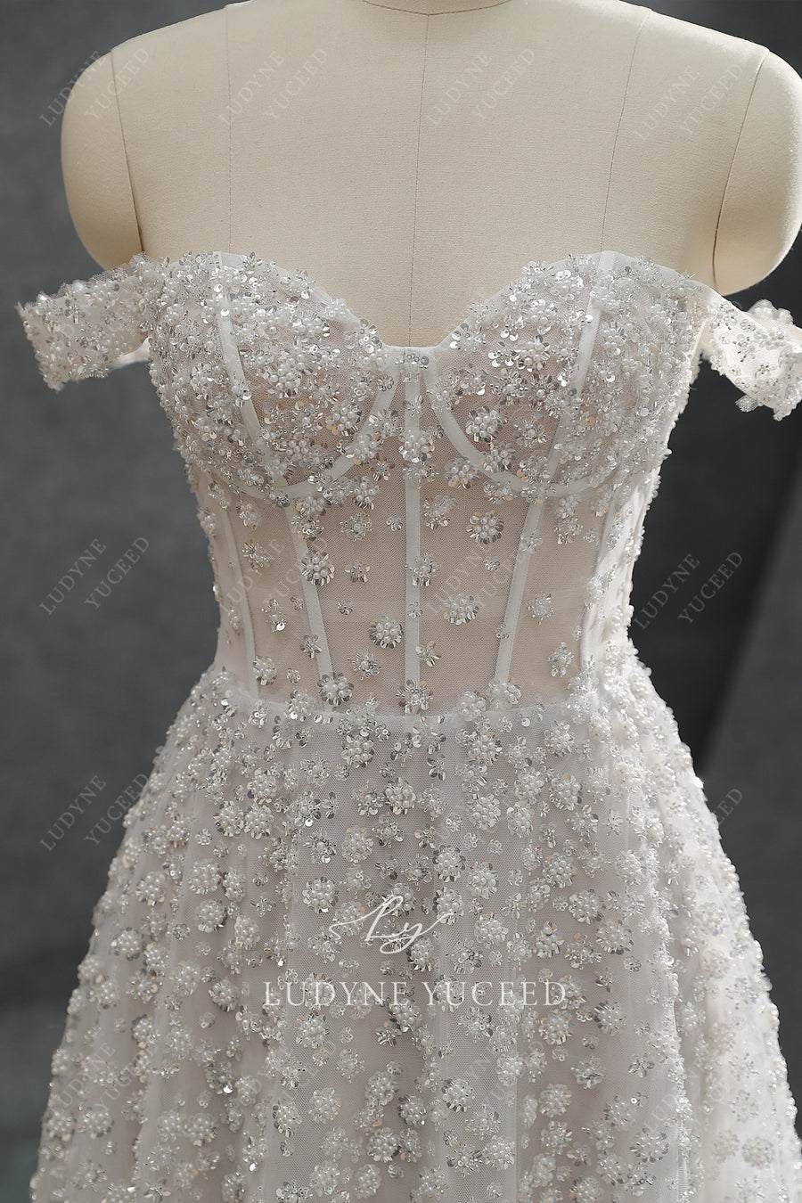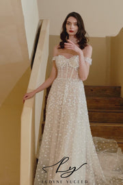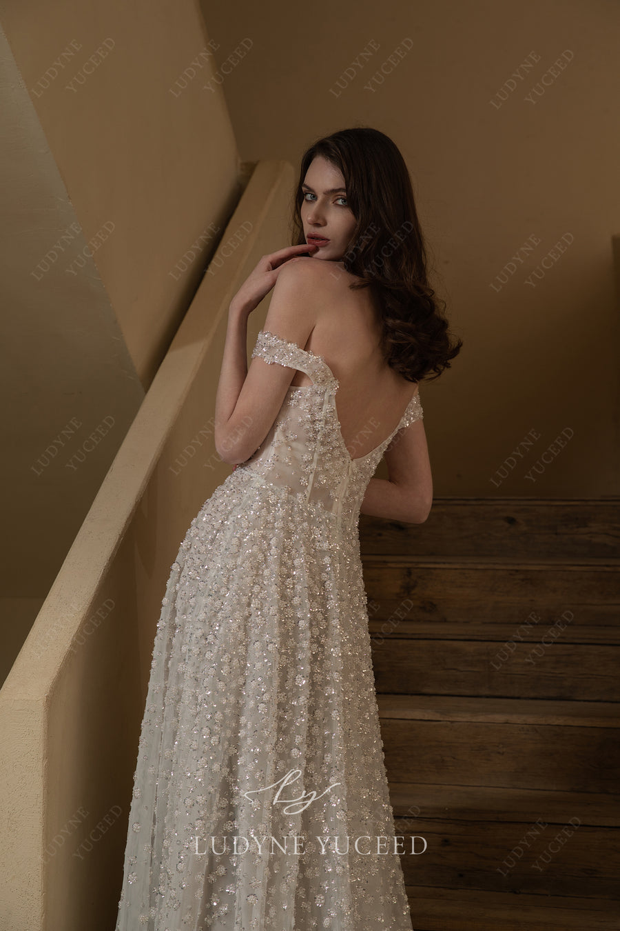The luxurious and dazzling 3274 wedding dresses, spare no effort in the A-line silhouette, and exquisite beading embellishes the entire gorgeous suit. Mesmerizing from every angle, the bodice is secured with exposed bodice boning to a sheer strapless bodice. The off-the-shoulder plunging neckline perfectly frames the bride's shoulders.