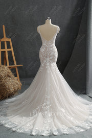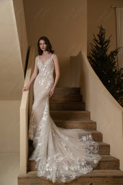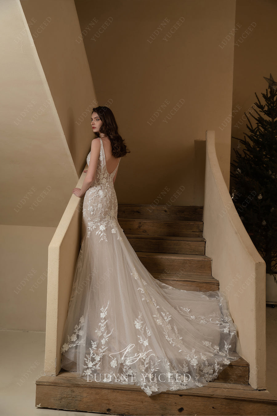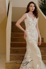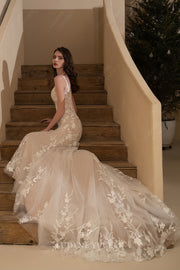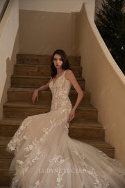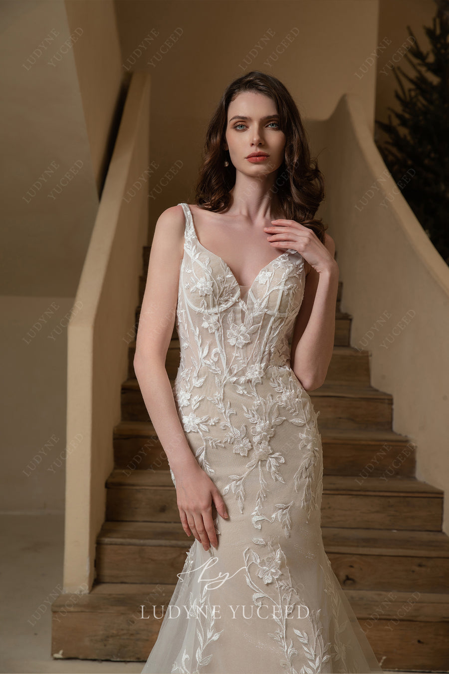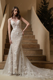 Made for a modern-day fairytale,this dress is the sparkling wedding dress of your dreams.The sultry fit and flare silhouette is enhanced by a plunging v-neck bodice and a low back. The sheer corset-inspired bodice provides sexy structure with expertly-placed boning in the bust and waist, while the rich floral laces extend through the length of the gown to flatter the figure. Stretch lining adds comfort and definition to the skirt, stopping at the floor to show off a cathedral length train.