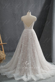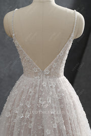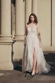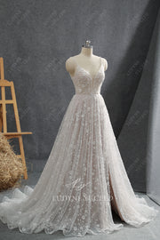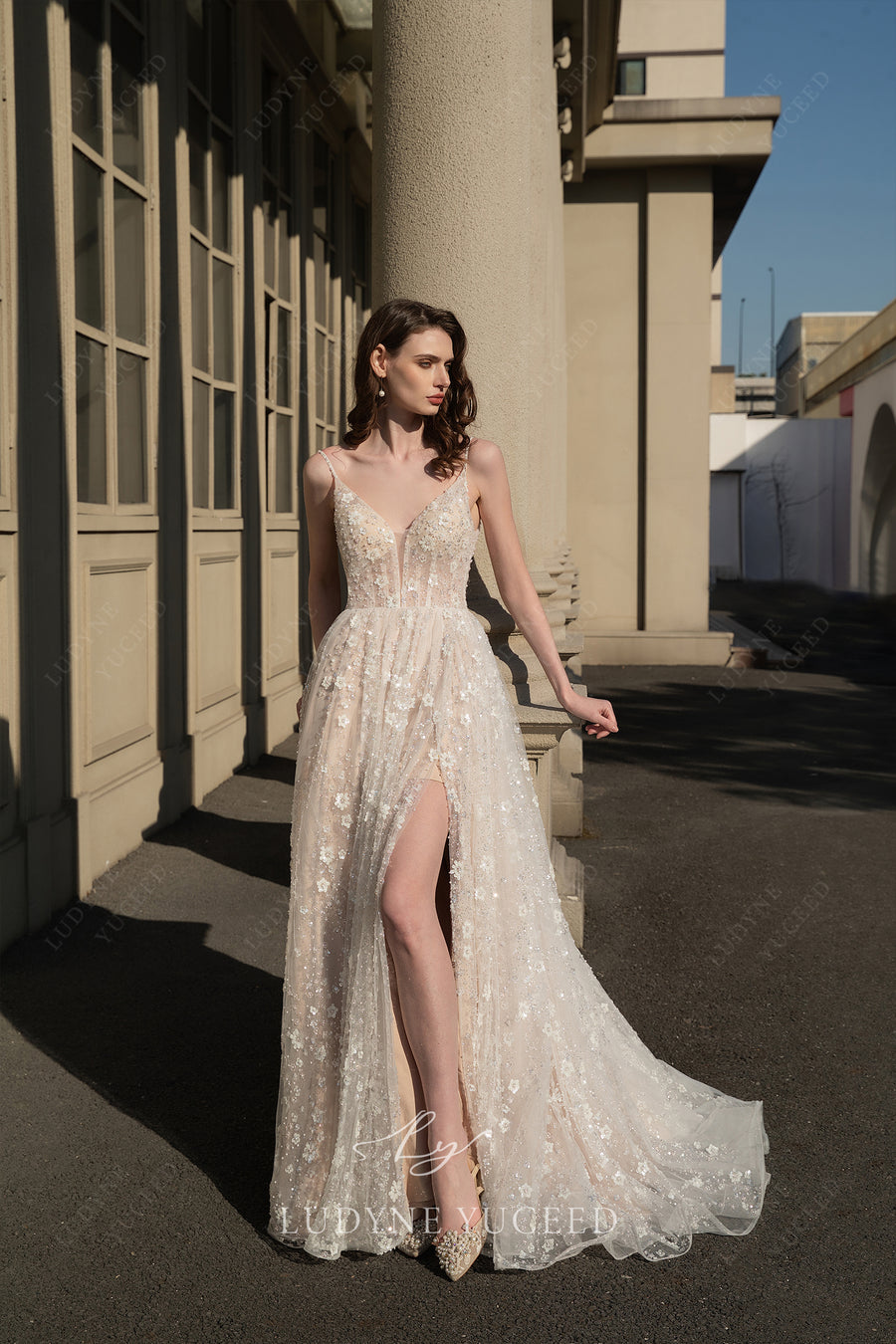 The life of the party has arrived,this wedding dress makes its grand entrance with some seriously gorgeous details! Spaghetti straps A-line wedding dress in sequinned tulle with a semi-sheer corset bodice bathed in exquisite embellished flowers allover, A sexy high slit within the skirt also makes a surprise appearance, the full flowy skirt features subtle pleats and a slit for a touch of unexpected sexiness.