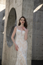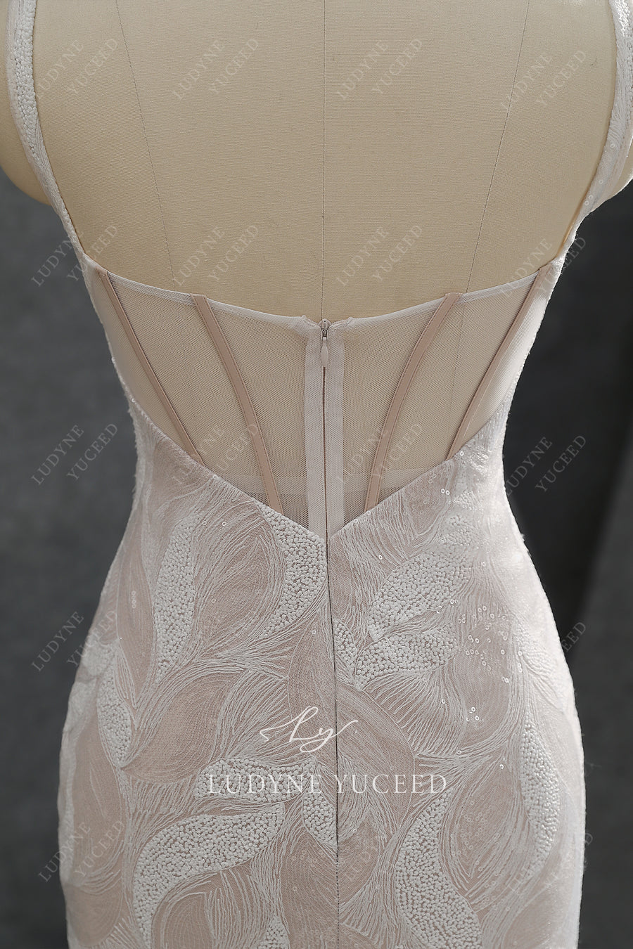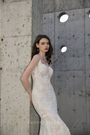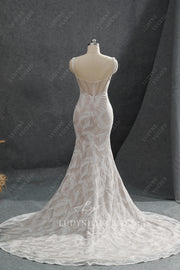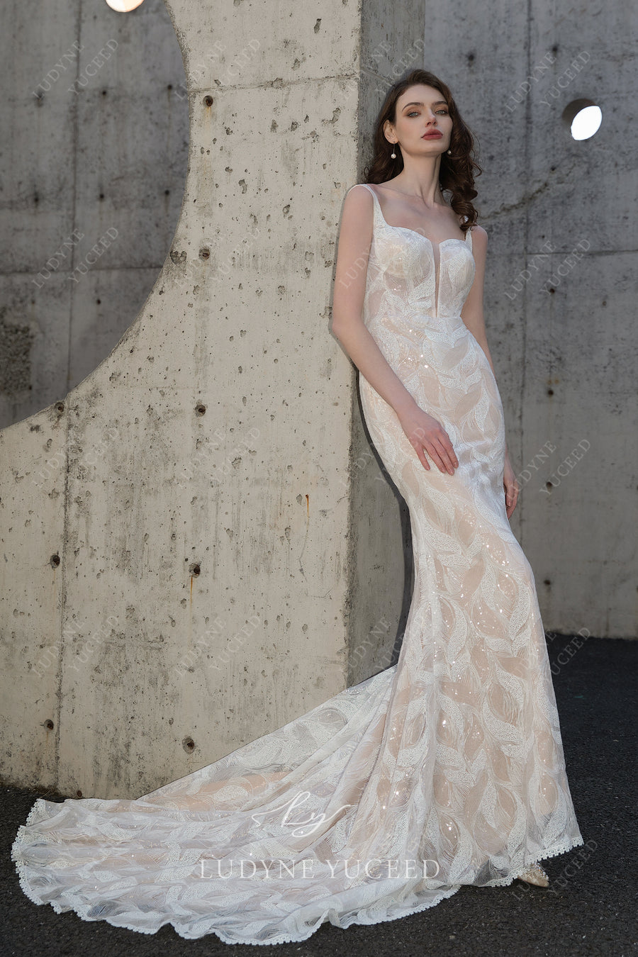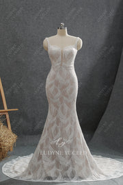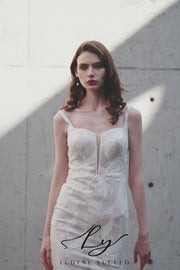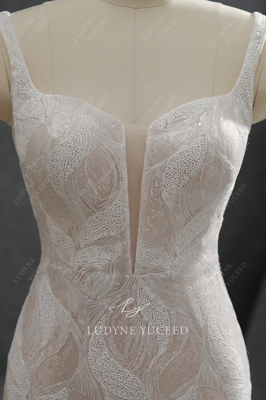 Stunning beaded lace brings the wow factor to this fashion-forward column wedding dress. From graceful shoulder straps, sheer lace envelops the fitted bodice with a plunging V neck in soft illusion. Detachable long sleeves with pearl buttons at wrist details complete the look.Skimming the curves of the body, the chic column silhouette resolves into a soft chapel train to complete this luxe lace bridal look.