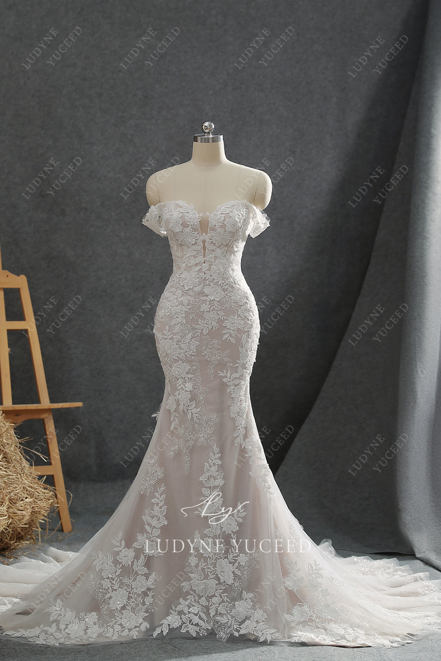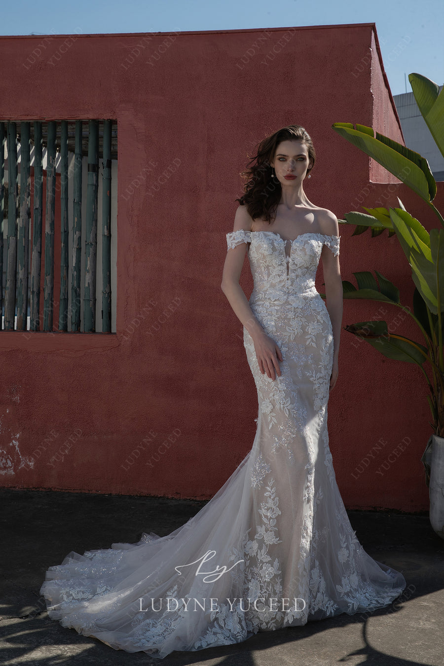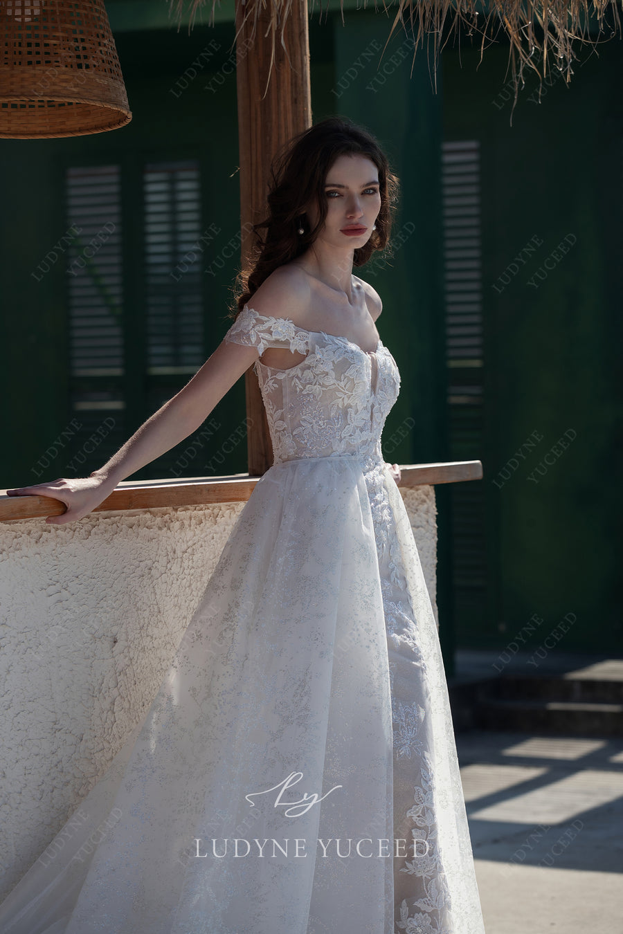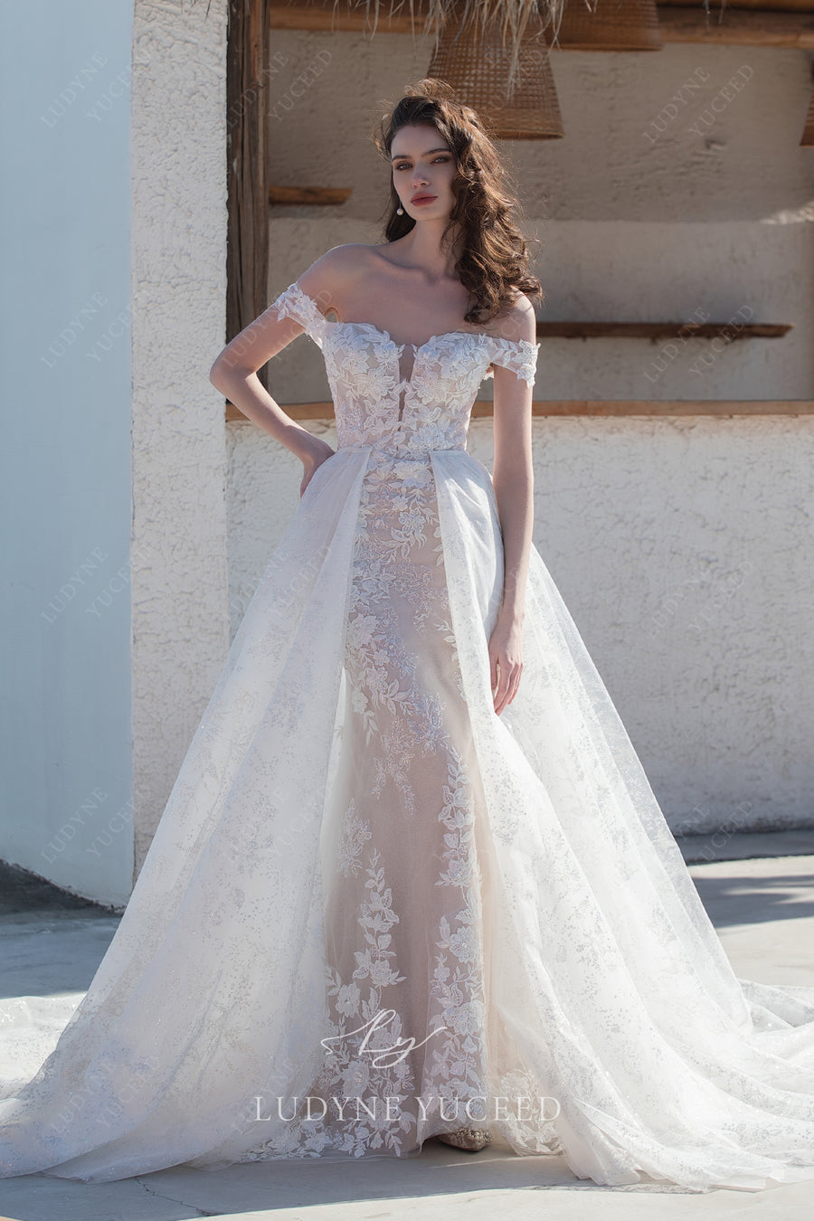Style LY3279 blends modern sophistication with timeless romantic bridal elements.From the soft off-the-shoulder lace straps, a contoured sheer bodice dives into a deep plunging neckline framed in the natural edges of the gorgeous floral lace. Past the hip, this romantic gown opens into soft floral appliques that trail the tulle layered skirt and train to complete this enchanting fit-and-flare wedding gown. For a final detail, a detachable embellished overskirt adds volume with its luxe delicate sparkle tulle and organza.
