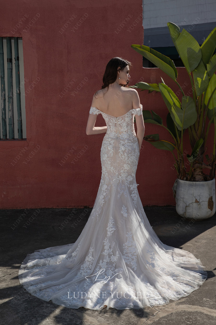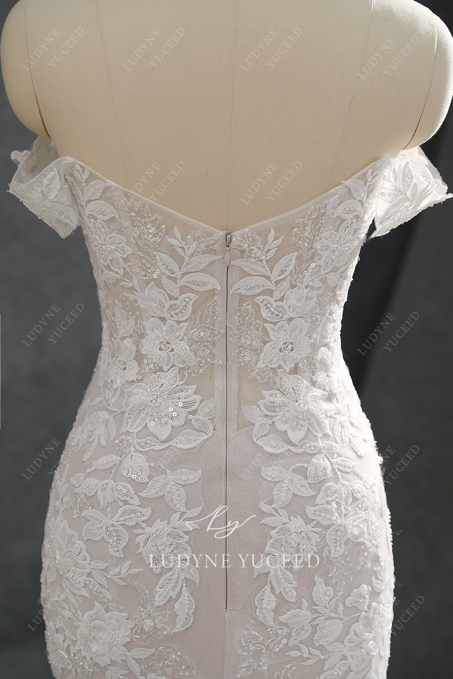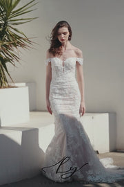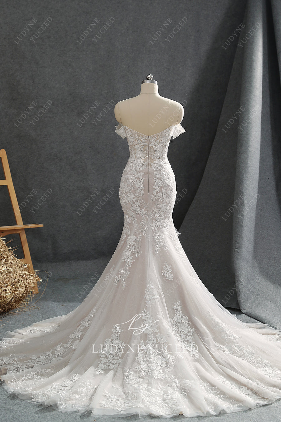 Style LY3279 blends modern sophistication with timeless romantic bridal elements.From the soft off-the-shoulder lace straps, a contoured sheer bodice dives into a deep plunging neckline framed in the natural edges of the gorgeous floral lace. Past the hip, this romantic gown opens into soft floral appliques that trail the tulle layered skirt and train to complete this enchanting fit-and-flare wedding gown. For a final detail, a detachable embellished overskirt adds volume with its luxe delicate sparkle tulle and organza.