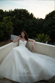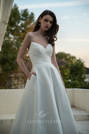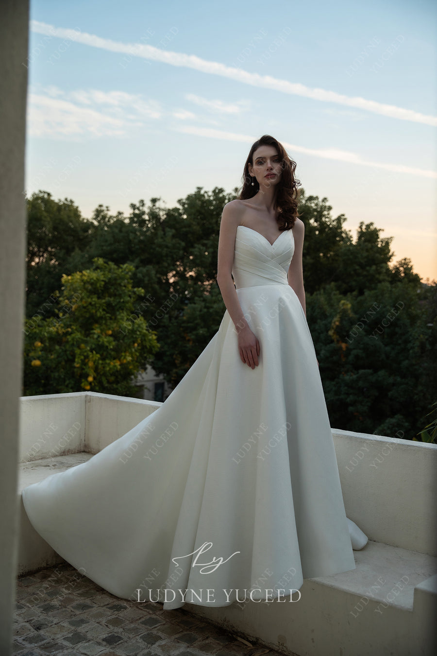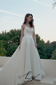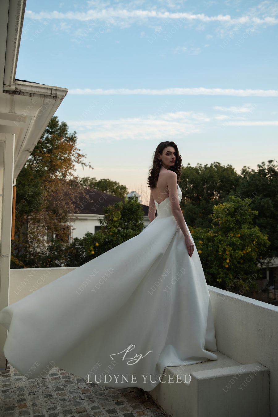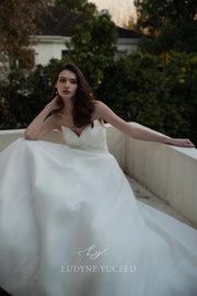 Simple, timeless and ultra-stunning, made for the minimalist bride who still wants to make a statement. This royal satin ballgown features a strapless sweetheart neckline, gorgeous ruched bodice and a flattering fitted waist. The subtle V-shaped back meets a bold and dramatic ballgown skirt with pockets for a head-turning bridal moment.