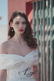 The matte satin of this structured contemporary ballgown makes this dress a truly lovely wedding dress for the modern bride. From a strapless sweetheart neckline, an impeccably-tailored bodice forms a clean and chic front bodice and a detachable scarf accent. Fabric-covered buttons run the course of the skirt and slight train, creating an overall timeless look for every modern bride.