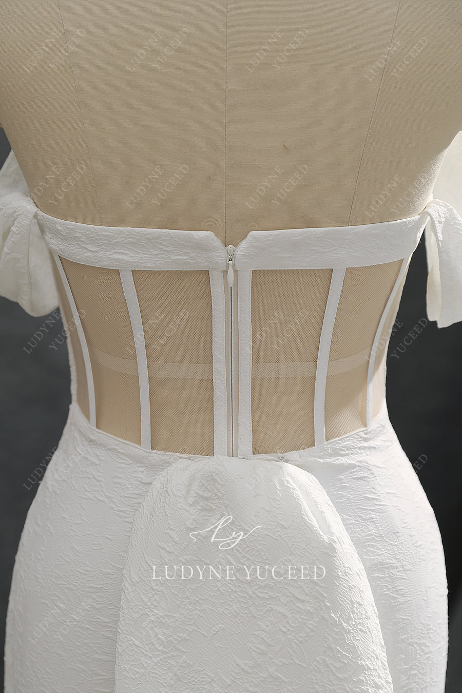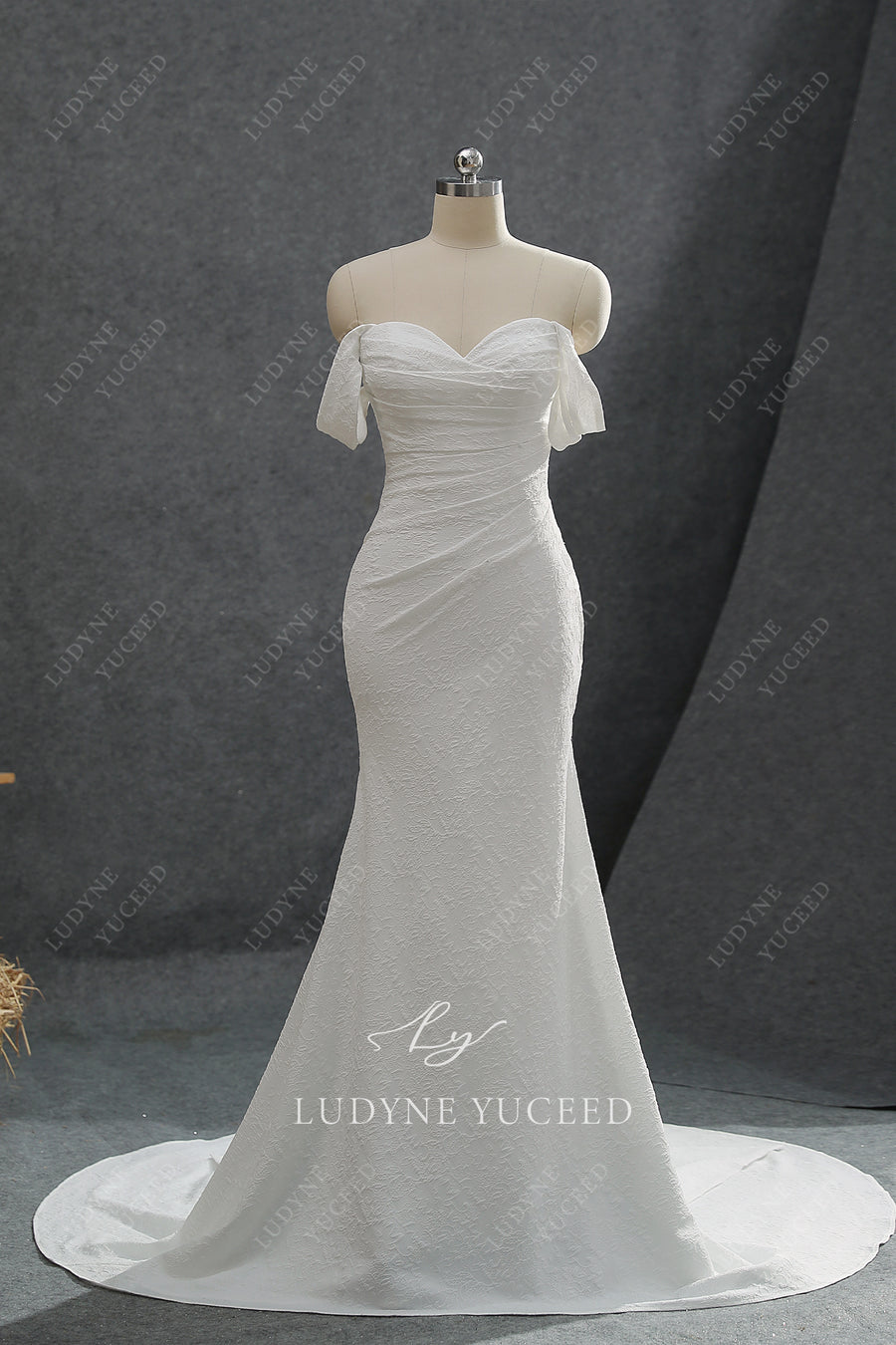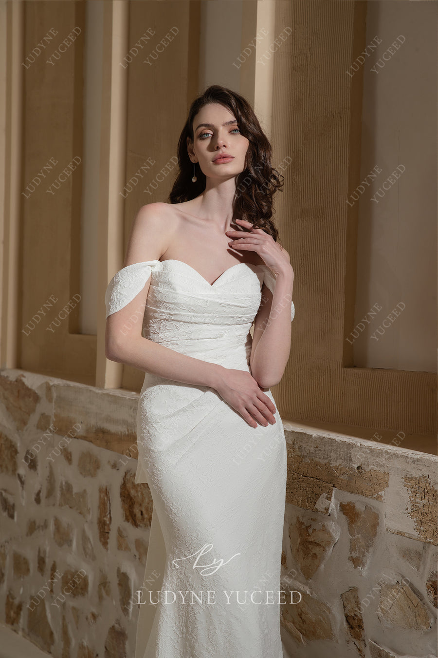 This fit and flare bridal gown will have you feeling sexy and elegant.Impeccably tailored and optioned in luxurious Jacquard Satin , the pleating continues down the skirt, hugging the body along the way. A cuffed sweetheart neckline creates off the shoulder straps, which lead to an unexpected illusion back with exposed boning. The detachable bow detail are so pretty and glamorous, made for a one-of-a-kind girl.
