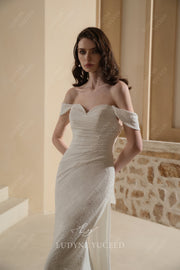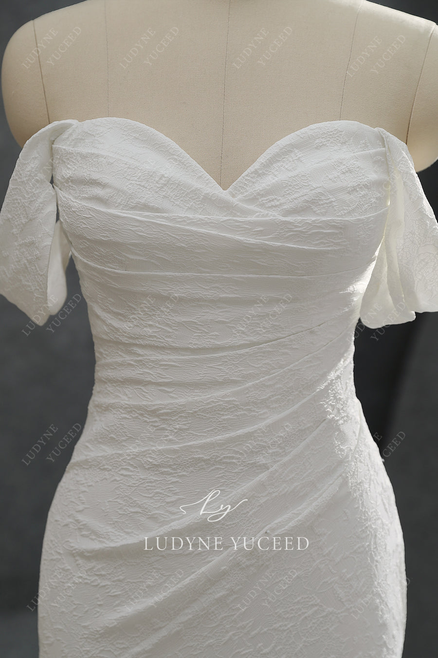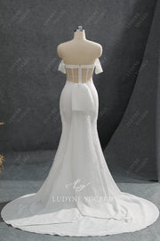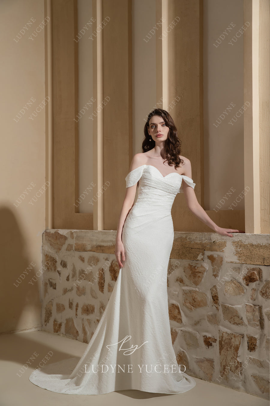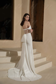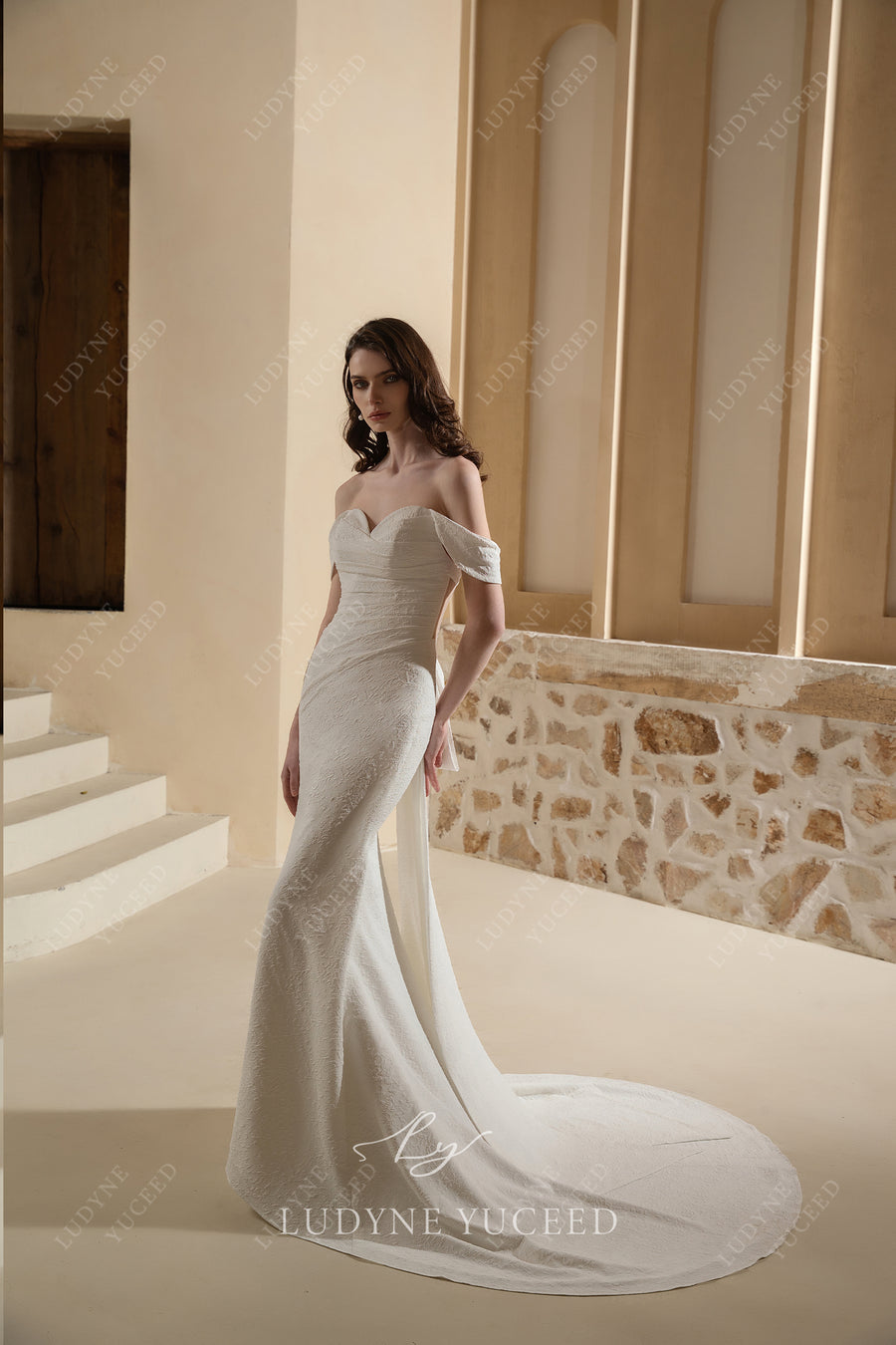 This fit and flare bridal gown will have you feeling sexy and elegant.Impeccably tailored and optioned in luxurious Jacquard Satin , the pleating continues down the skirt, hugging the body along the way. A cuffed sweetheart neckline creates off the shoulder straps, which lead to an unexpected illusion back with exposed boning. The detachable bow detail are so pretty and glamorous, made for a one-of-a-kind girl.