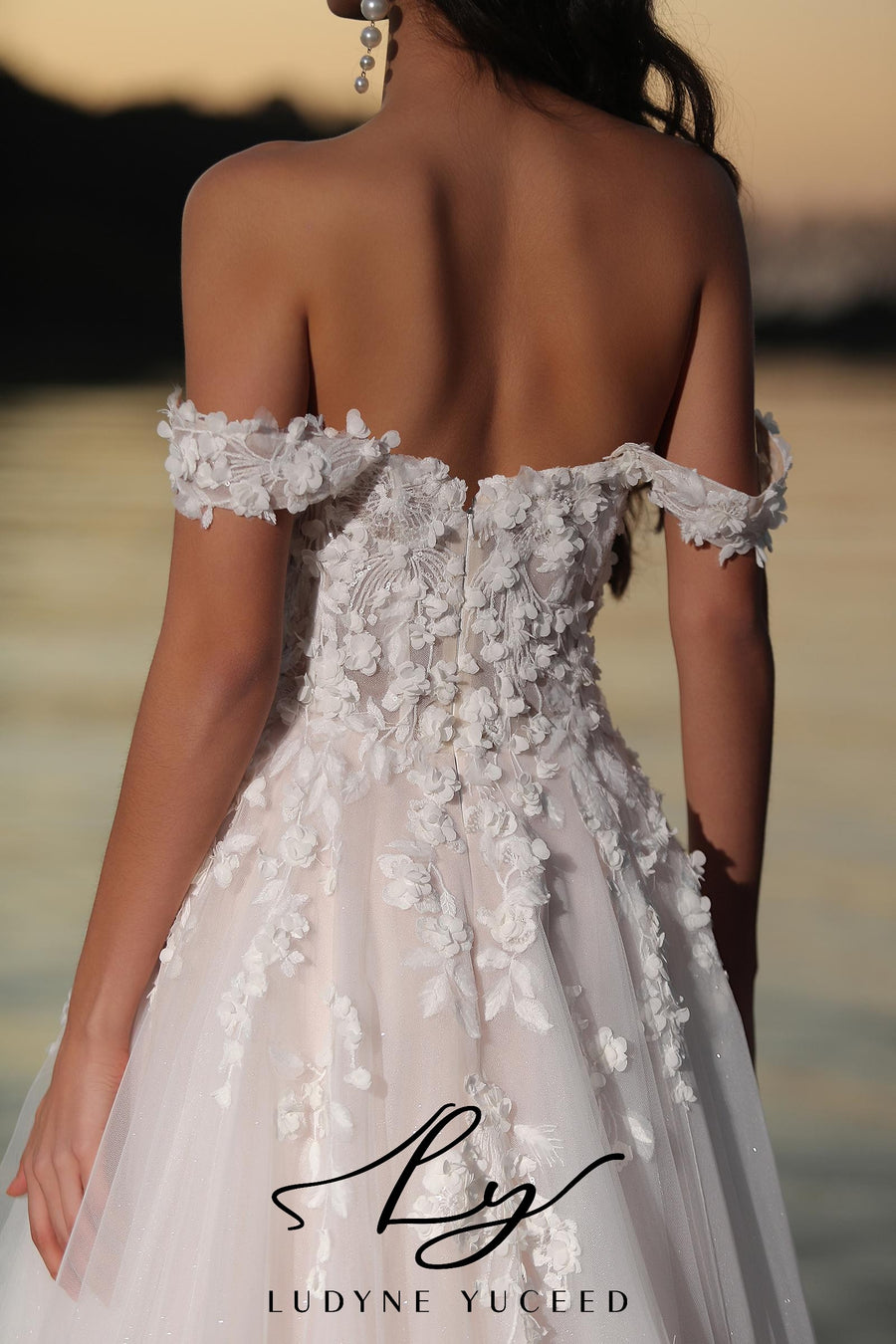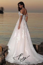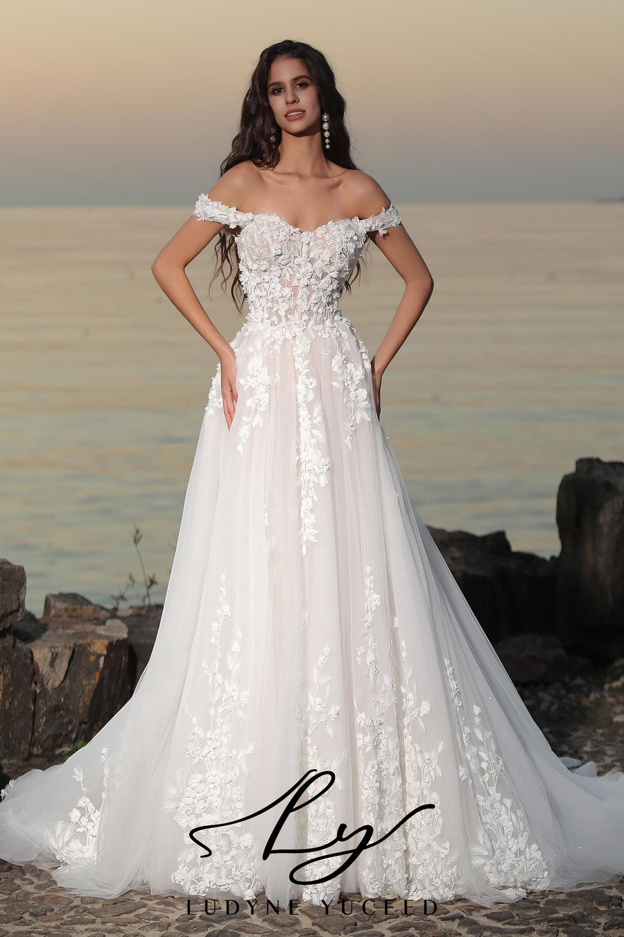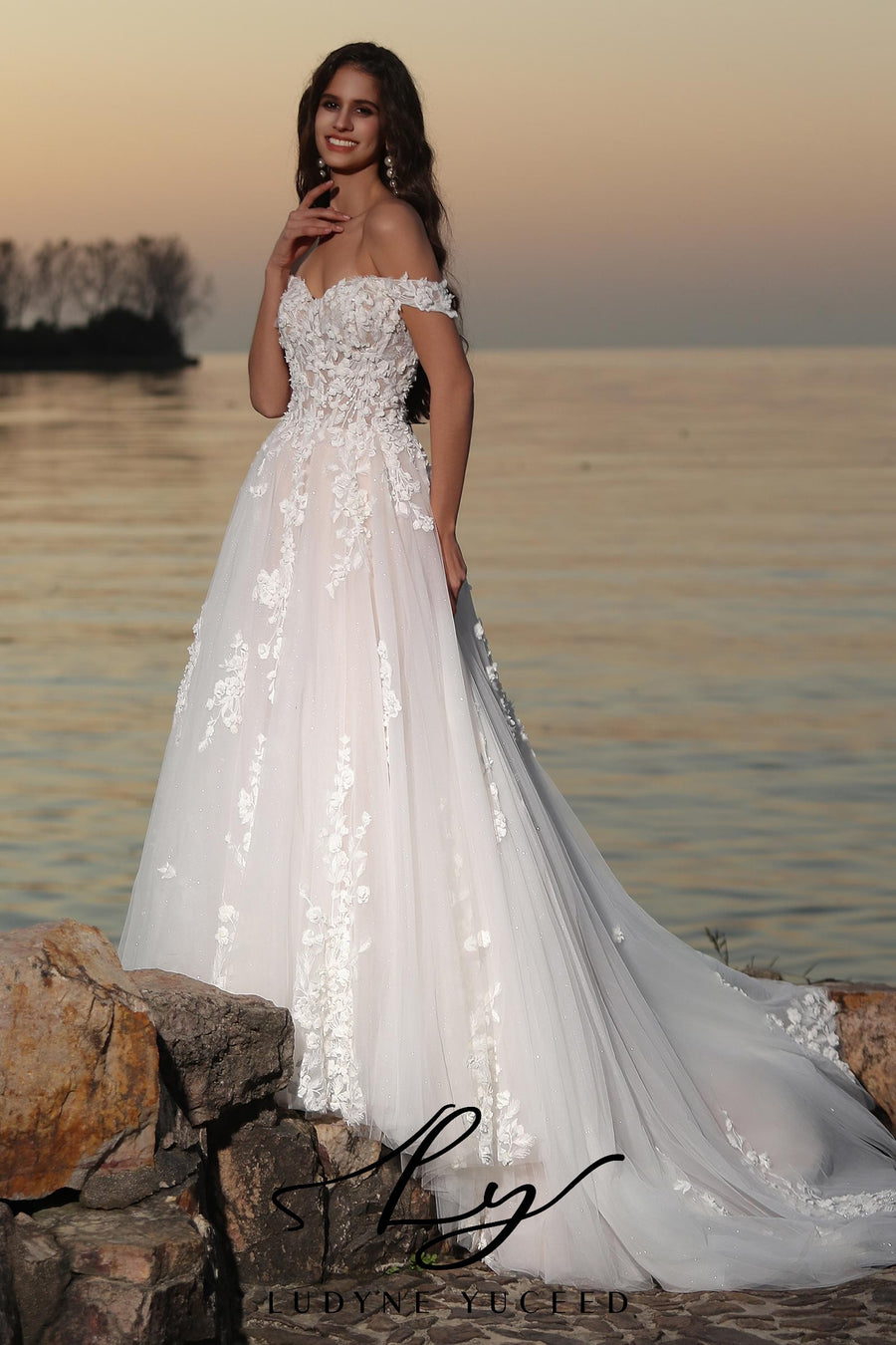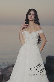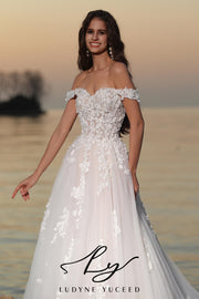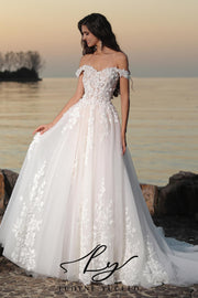 Off the shoulder A line wedding dress LY3518 is the most exquisite lace work of art in the wedding gown world. The bodice is richly embellished with 3D floral lace appliqués that extend throughout the skirt, The full, tulle skirt adds a touch of whimsy.This wedding dress is also available in plus sizes.