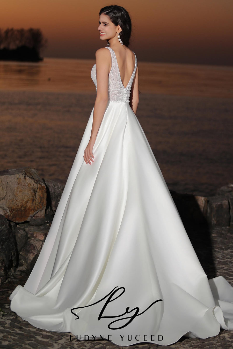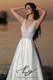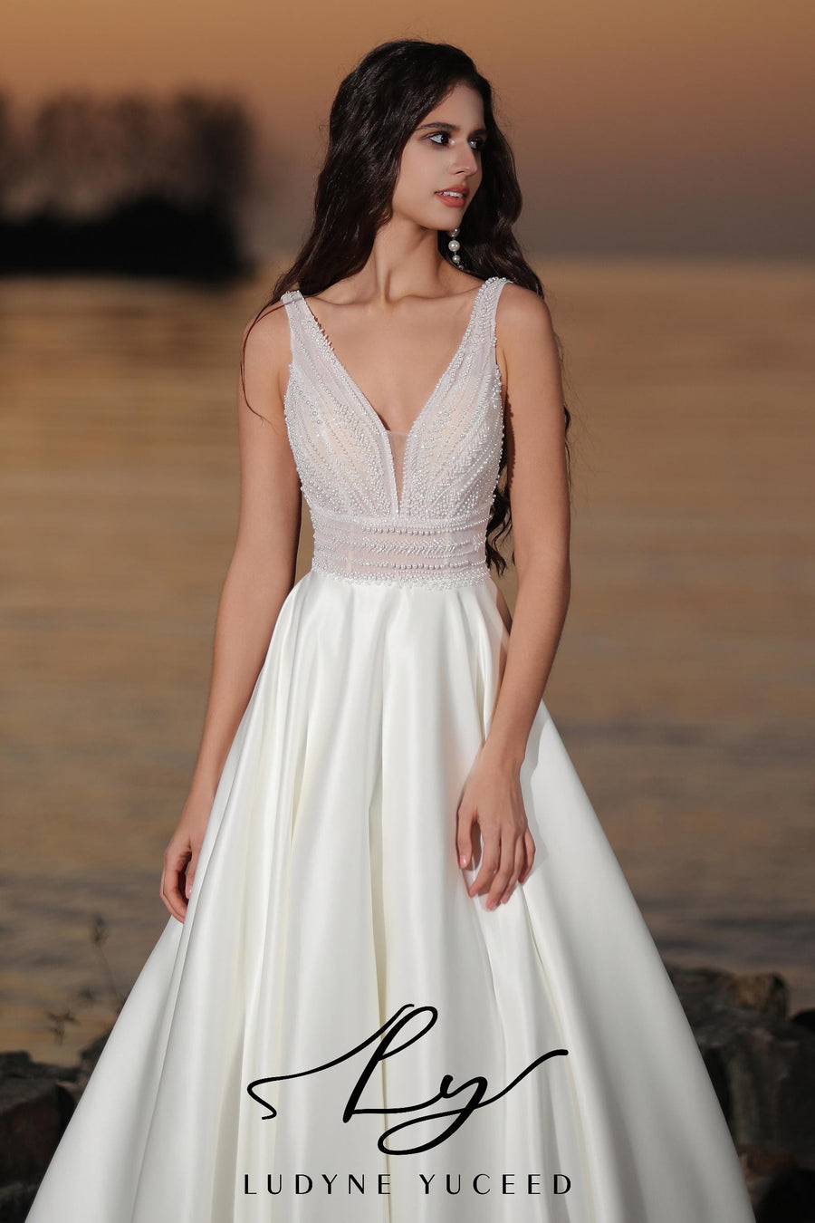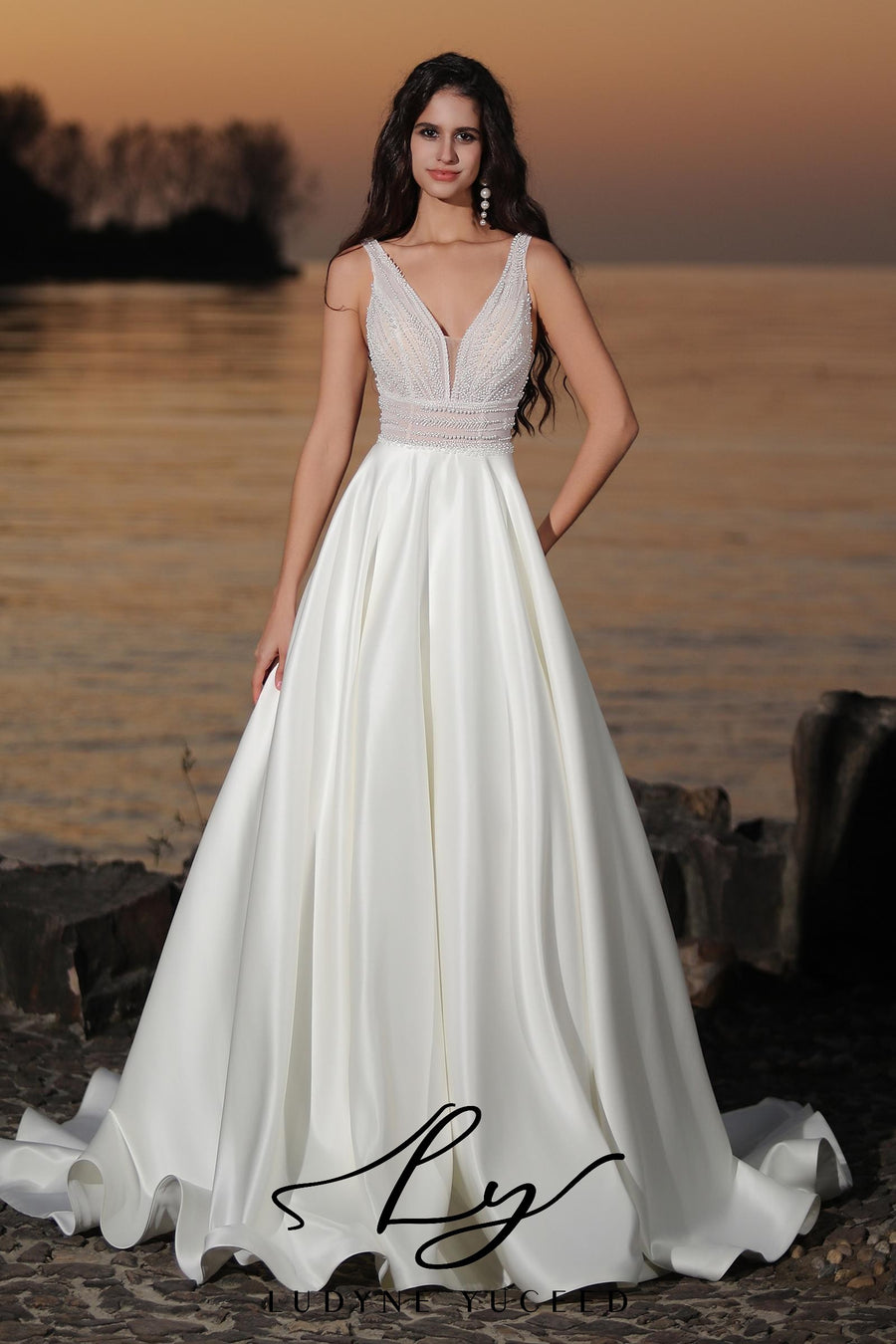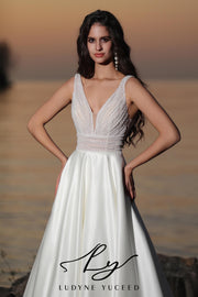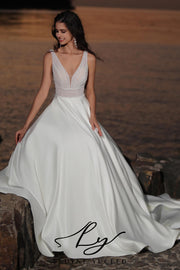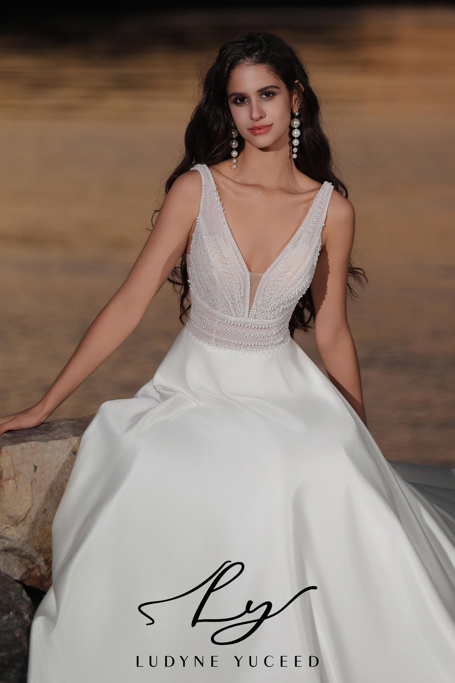Fashion forward A-line wedding dress is gorgeous, luxurious and sexy featuring a modern geometric pattern rendered in glittering pearls, sparkling beaded straps and a mesmerising V-neckline on a sexy bodice. Starting at the waist, the soft A-line satin skirt slowly unfolds as the striking pearls pattern repeats across the A-line gown, mesmerising with every sparkle and movement, epitomising the modern bride's luxurious wedding dress style.